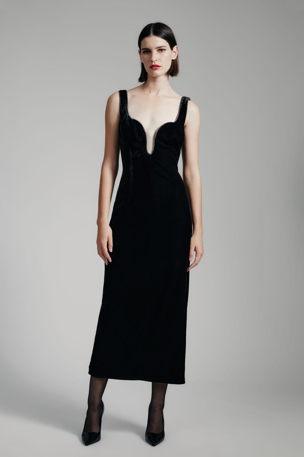 Midi šaty Brooklyn Velour jsou dokonalým dojmem v nápadné sametové siluetě s hlubokým výstřihem, rozparkem na zádech a vyklenutými zády.