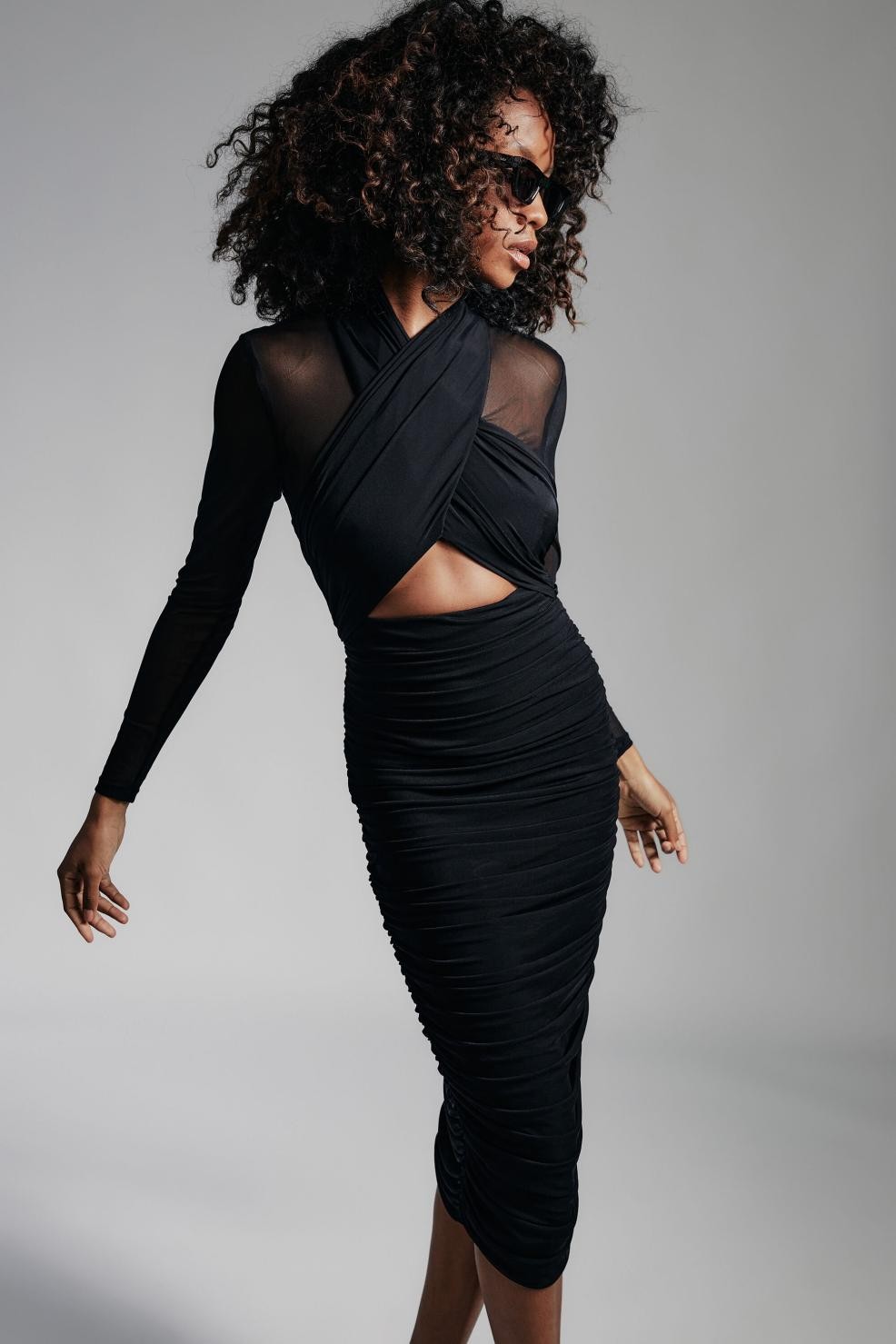 Beheers de nacht in de Aliyah-jurk. Deze stijl heeft een halter-geïnspireerd wikkeldetail op het lijfje, een uitsparing aan de voorkant, een aansluitende midi-rok, doorschijnende lange mouwen en een zichtbare rits middenachter.