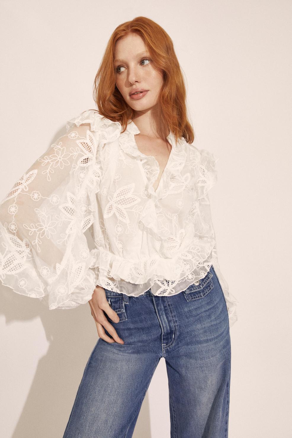 Bluzka z haftem Frill to kobieca estetyka z zachwycającym wzorem. Ta prosta w noszeniu bluzka ma falbaniasty dekolt w serek, falbany na bufiastych rękawach i kopertowy gorset, a wszystko to w klasycznej bieli orchidei.