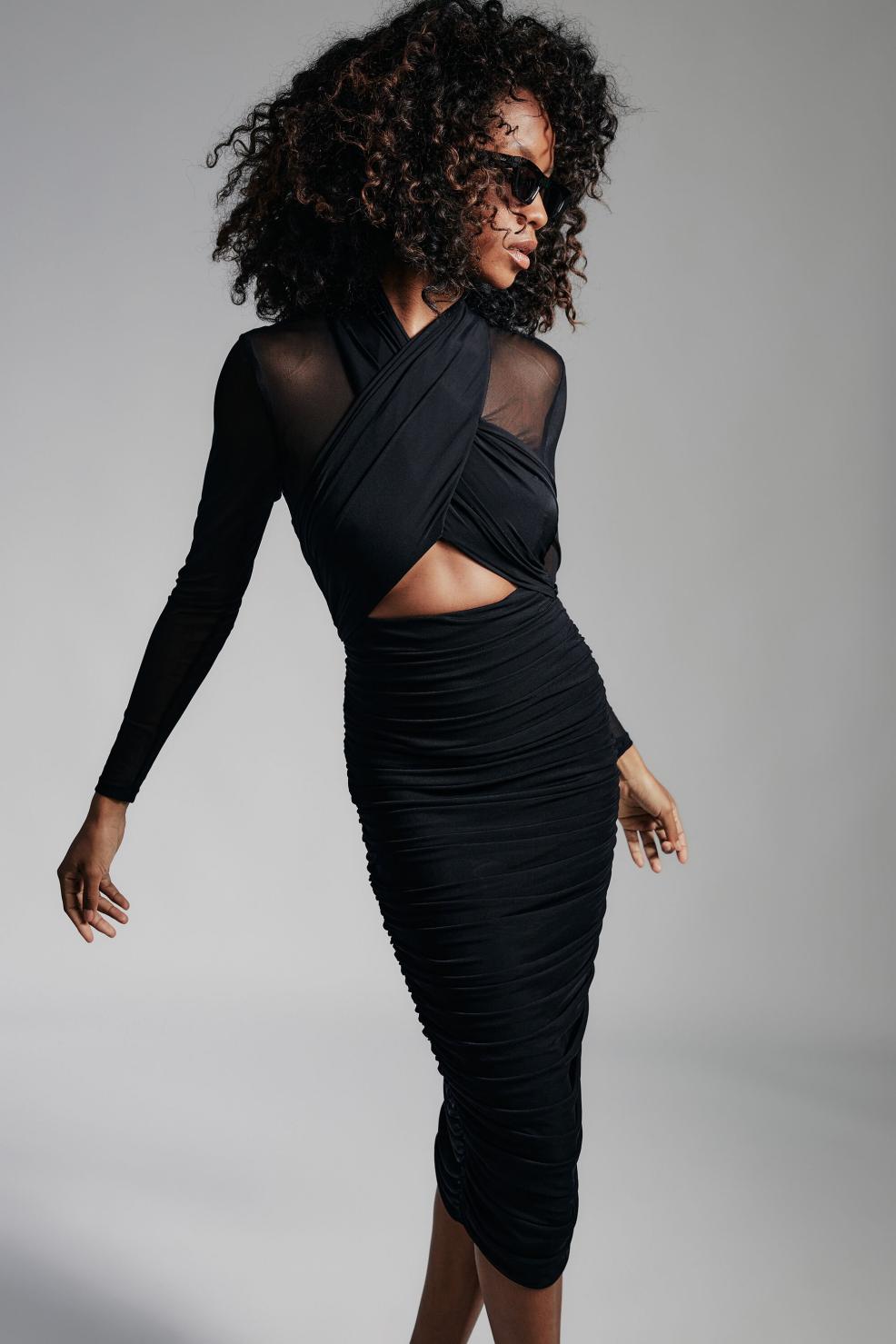 Zawładnij nocą w sukience Aliyah. Ten model charakteryzuje się gorsetem z kopertowym dekoltem inspirowanym halterem, wycięciem z przodu, spódnicą midi o długości midi, przezroczystymi długimi rękawami i odsłoniętym zamkiem błyskawicznym z tyłu.