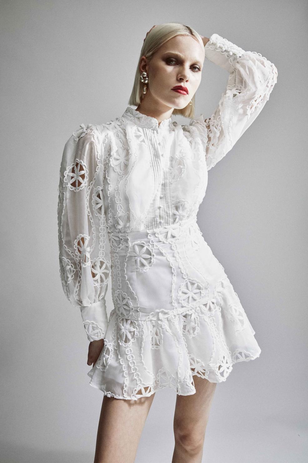 Gardenowe przyjęcie w wyrafinowanej odsłonie. Sukienka Remy Lace Dress ma lekki, mini fason z długimi, obszernymi rękawami, wysokim kołnierzykiem typu stójka, zapięciem na guziki z przodu, haftowanymi detalami i falbaną u dołu.