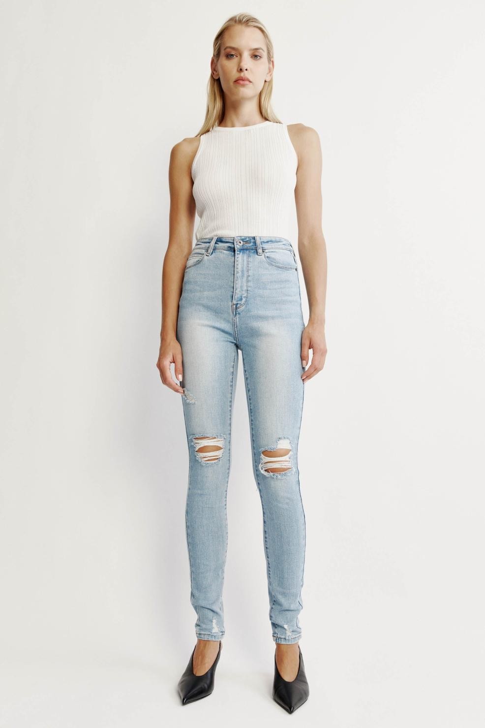 Blugi Khloe Super High Tall în albastru mediu | Blugi skinny Bardot pentru femei