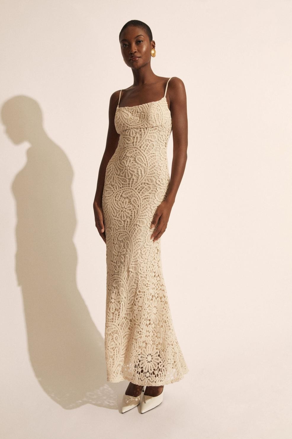 Adoni Tığ İşi Midi Elbise, ince askıları, zarif yuvarlak yakası ve yumuşak kloş eteğiyle vücuda oturan bir silüete sahip dokulu, tığ işi bir tasarımdır. Sofistike bir görünüm için nötr bir topukla tamamlayın.