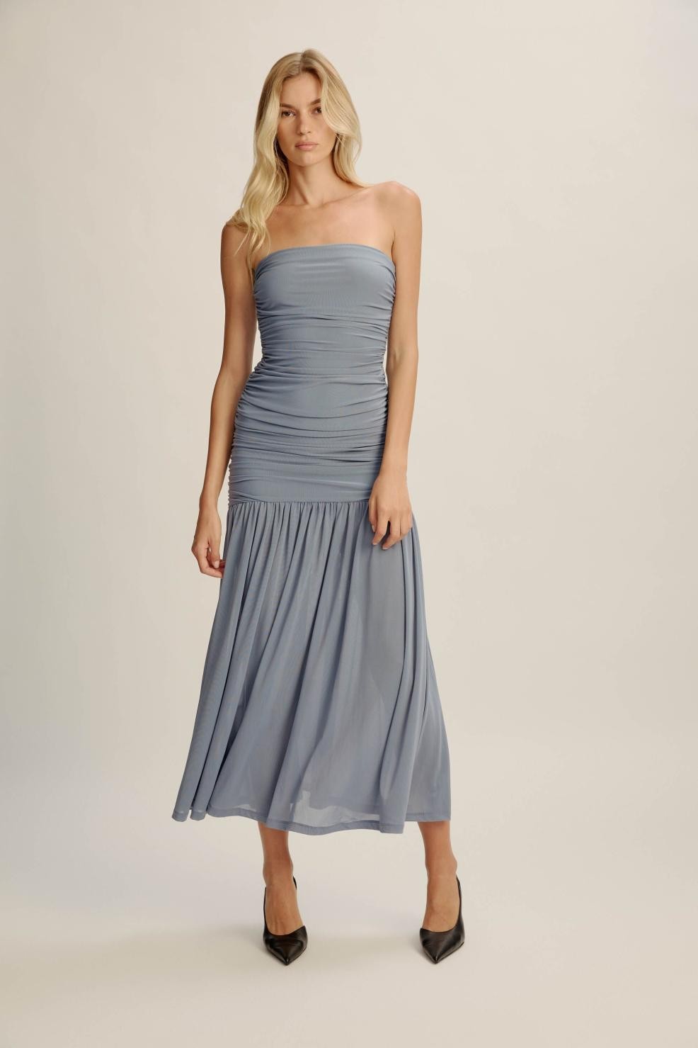 Plan yapmaya değer. Büyüleyici toz mavisi tonunda Solana Mesh Maxi Elbise, dar korsajı, toplanmış detayları, düşük beli ve akıcı eteğiyle askısız bir tasarıma sahiptir.