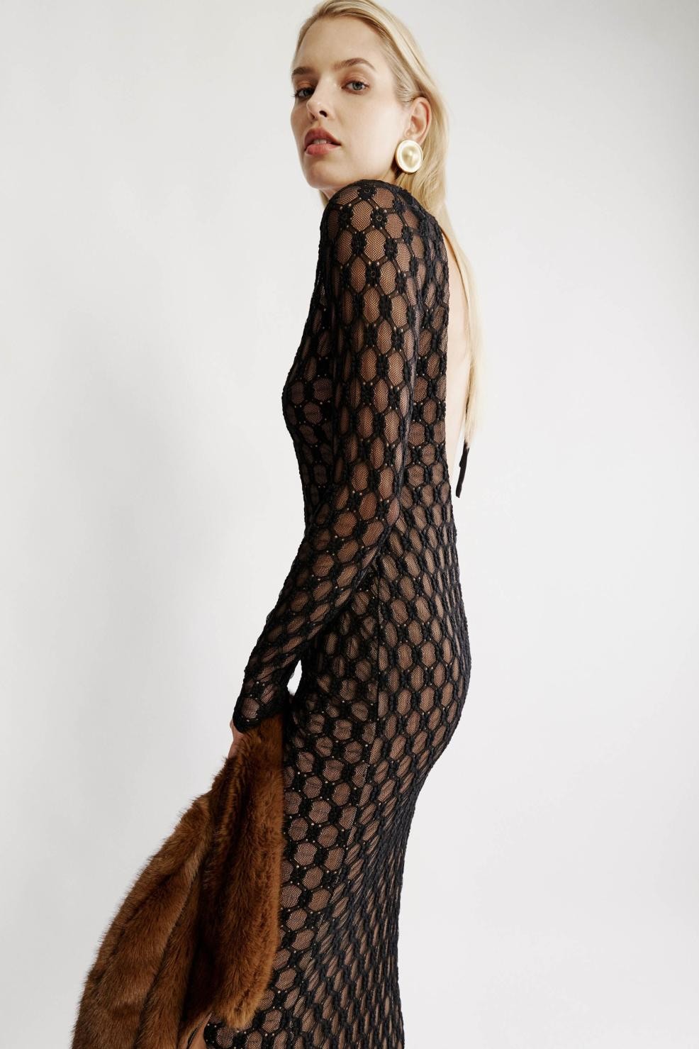 Vücudu saran. Yazmin Dantel Midi Elbise, göğüs bağcık detayı ve cesur açık sırtıyla rüya gibi bir silüete sahiptir. Modern file kumaştan üretilen bu midi elbise, unutulmaz anlar için tasarlandı.
