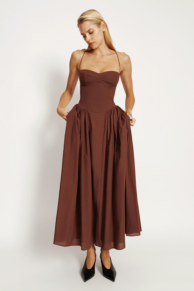 Estie Çikolata Rengi Pamuklu Uzun Elbise | Kadın Bardot Gündüzden Geceye Elbiseler