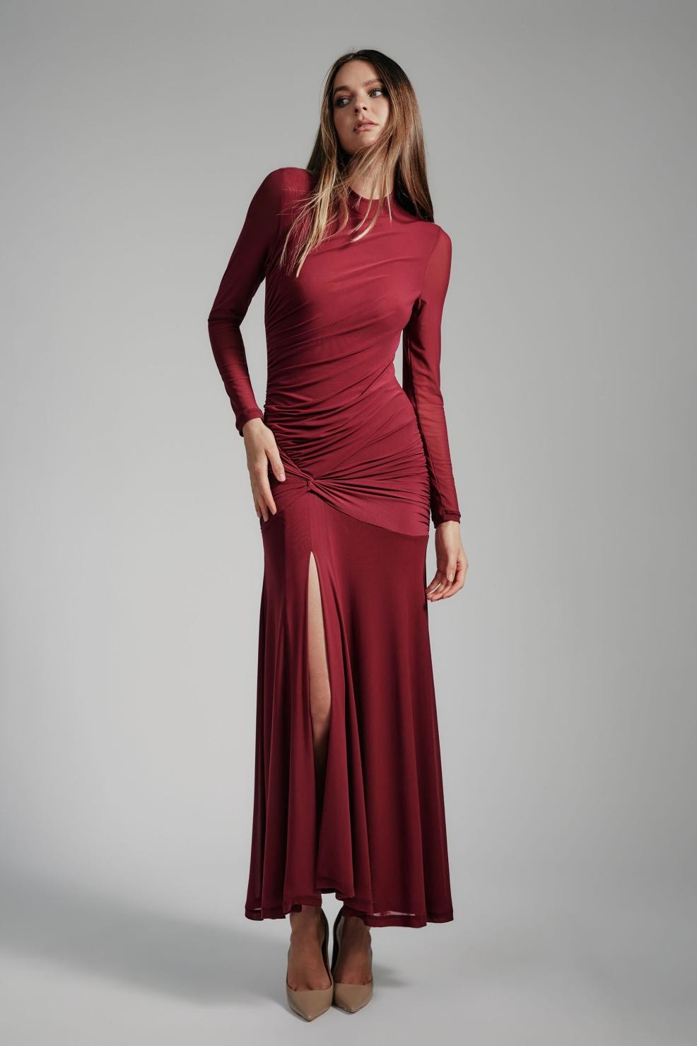 Etkinlik göz kamaştırıcı. Liyana Ruched Mesh Elbise, yüksek yaka, uzun şeffaf kollar, büzgülü bel paneli, ön yırtmaç ve akıcı etek ucuyla ağır, uzun bir silüete sahiptir.